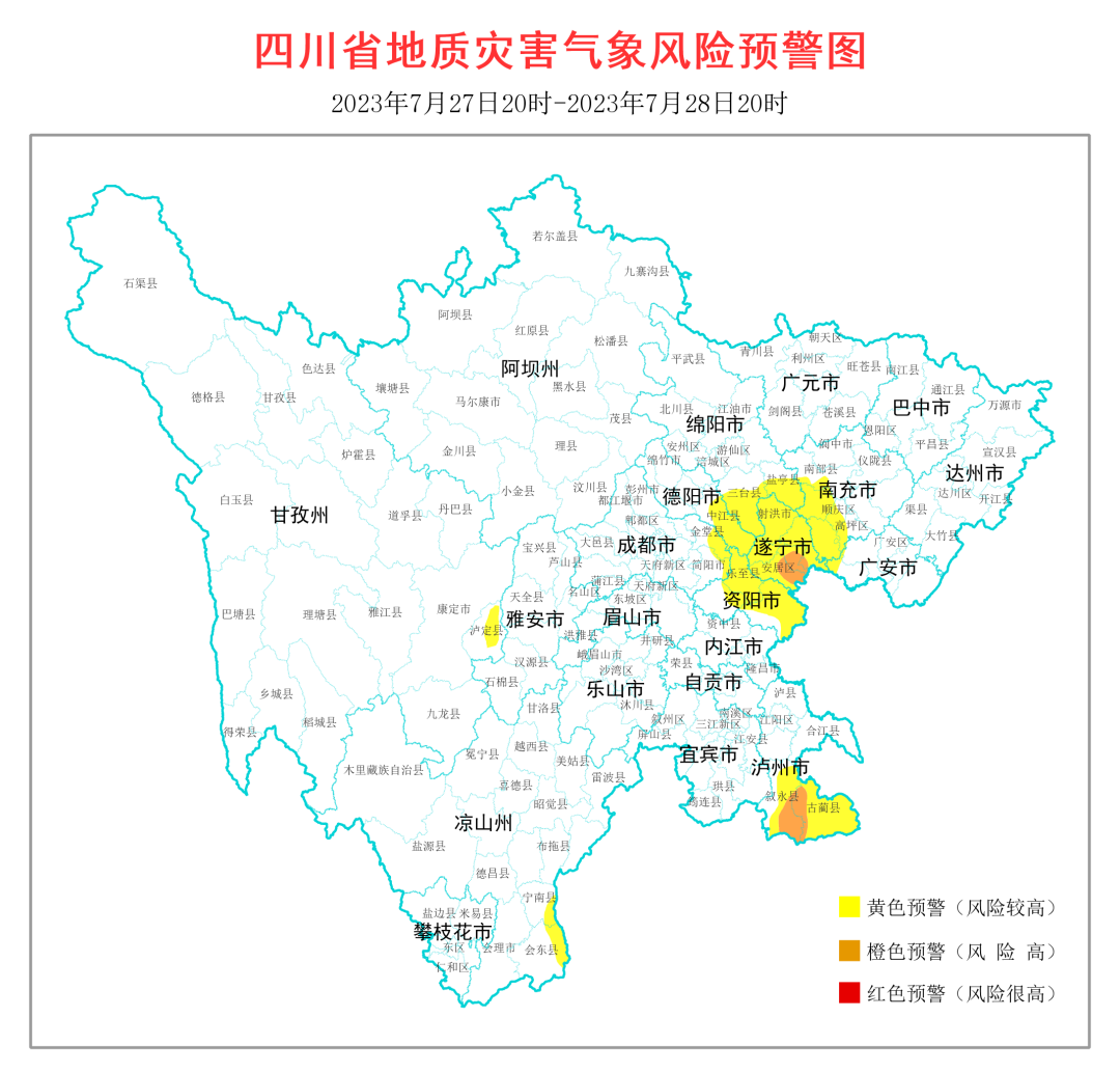 另一方面 四川省地质灾害指挥部办公室发布 7月27日20时至7月28日20时 全省地质灾害气象风险预警