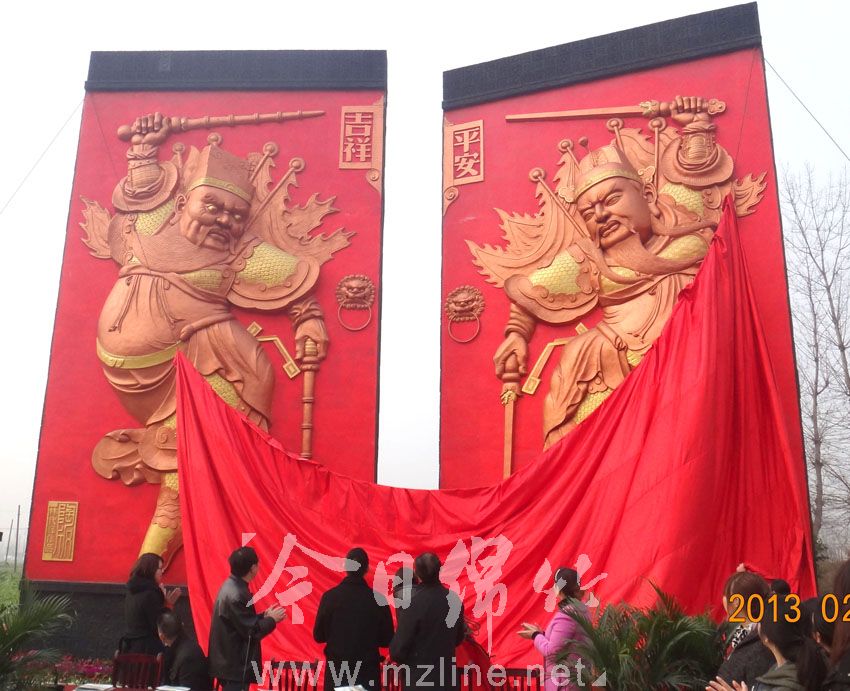 本刊消息 日前,孝德镇年画村万福广场年画门神顺利落成,举行了隆重的揭幕仪式。 据悉,近年来,随着绵竹旅游业的不断升温,年画村积极利用得天独厚的区位优势和历史文化资源,使年画村由昔日一般行政村一跃成为全市、全省乃至全国有一定影响的旅游景区。为了更好地推进年画村发展,年画村管理委员会在年画村入口处启动建设了万福广场。该广场的建成,将进一步展现年画村景区民俗文化旅游特点,推动年画村民俗文化生态旅游业的大力发展。 据了解,年画村万福广场占地2000平方米,年画门神高10.5米,宽5米。两扇门神相对而立,绘画内容为绵竹年画门神的代表作《双扬鞭》。红色的门神矗立在万福广场,成为年画村最耀眼的标志物,当地群众戏称为“大红门”。两扇门中间,“福”字印入眼中,寓意开门见福。 |