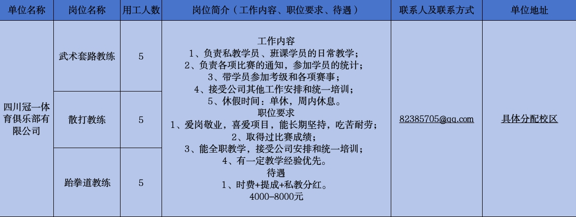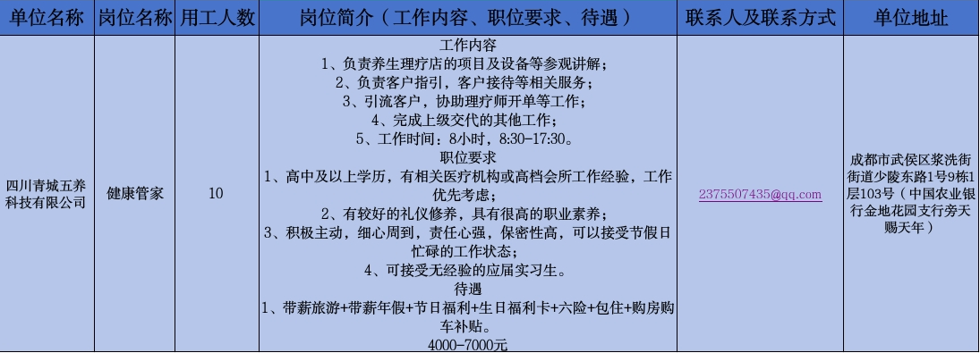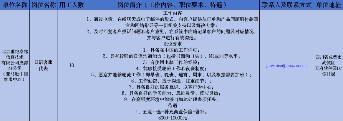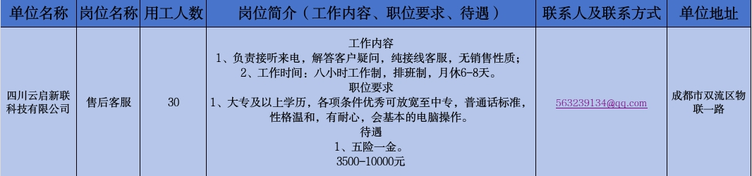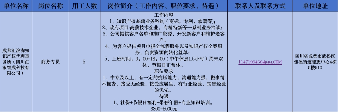 还在为找不到工作苦恼?那就看过来,总有一款适合你。一大波“岗位速递”等着你! 一、四川冠一体育俱乐部有限公司 二、北京世纪卓越信息技术有限公司成都分公司(亚马逊中国客服中心) 三、成都汇浪淘知识产权代理事务所(四川汇浪智成科技有限公司) 四、四川青城五养科技有限公司 五、四川云启新联科技有限公司