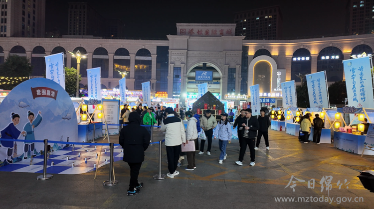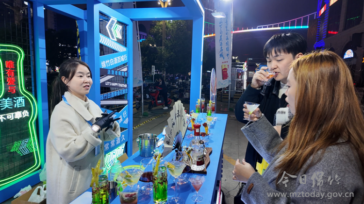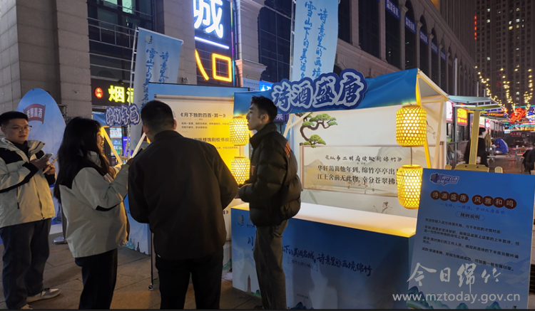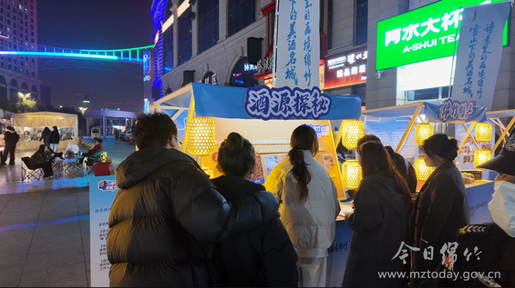 夜幕降临,华灯初上,市集现场人潮涌动,不少当地市民专程前来体验。现场精心设计了“绵竹酒香特调区”“六粮酿造展示区”“诗酒盛唐互动区”等多个特色板块。极具设计感的“绵竹白酒百城行”艺术装置内部空间以绵竹年画、唐诗元素装饰,营造出浓厚的文化氛围。
