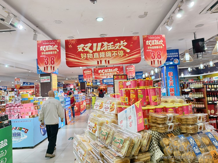 “不用等快递,现货直接提,价格比线上还划算。”11月10日,在尚品德龙超市生鲜区,刚选完特价羊肉的市民周蓉,购物车里堆满了粮油与日用品。 记者在尚品德龙超市看到,超市内四处悬挂着“双11狂欢”的宣传语,购物节的氛围十分浓厚。生鲜区的时令蔬菜、鲜肉水产,以及粮油调味、家居百货区,均推出全场商品低至3.8折起的活动,吸引了大批市民驻足选购,收银台前已排起长队。此外,超市入口处还设有抽奖区域,不少市民购物后纷纷驻足参与,期待收获额外惊喜。