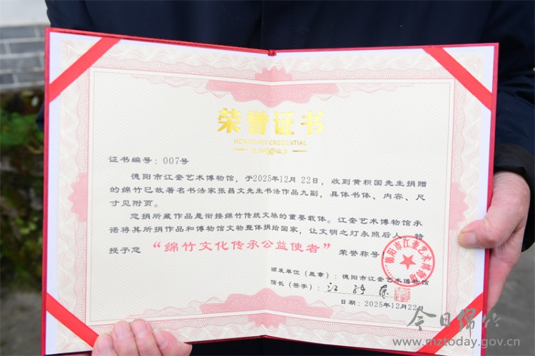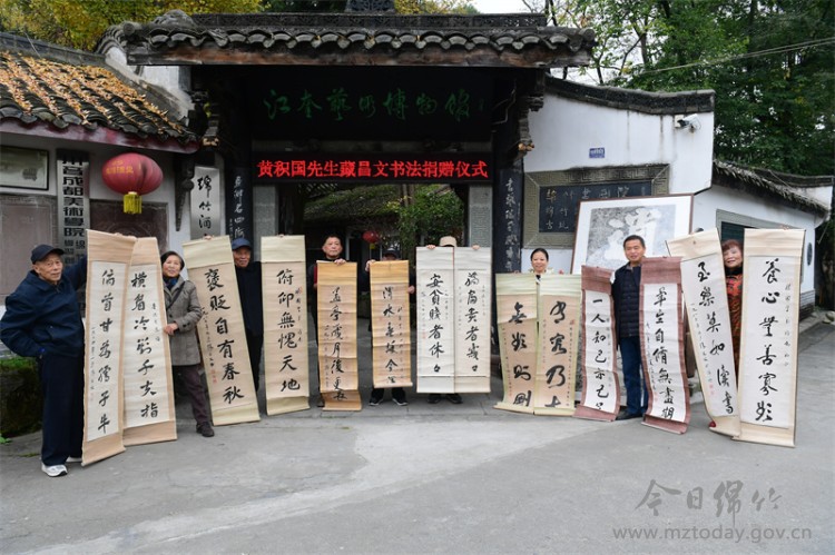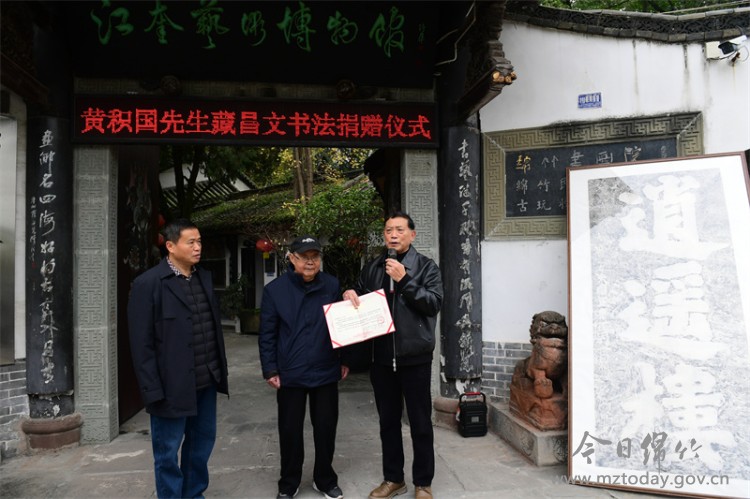 11月22日,黄积国、卢天泉收藏的绵竹已故书法家张昌文书法和颜真卿巨幅古拓片捐赠仪式在德阳市江奎艺术博物馆举行。 当日,76岁的黄积国老先生把老师张昌文于二十世纪七八十年代为其题写的9幅书法作品,捐赠给该馆永久收藏。