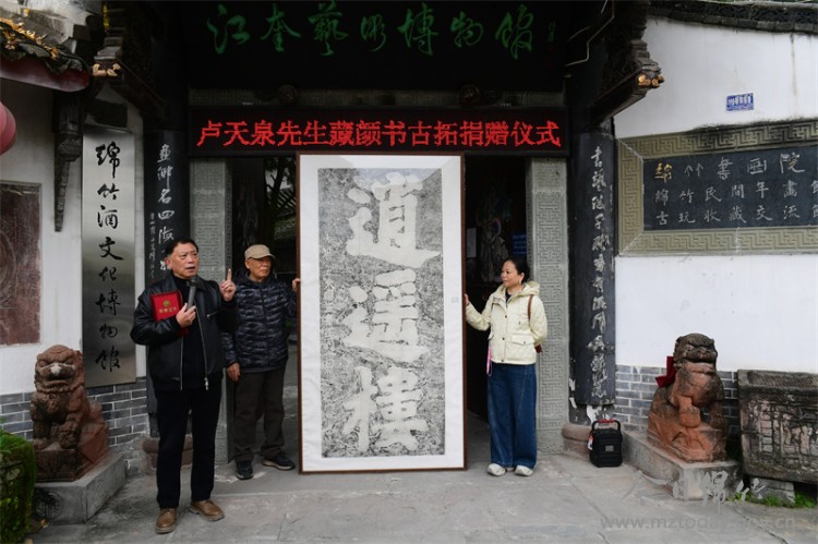 卢天泉(左二)藏颜真卿榜书大字《 逍遥楼》清代拓片 江绪奎分别向黄积国、卢天泉颁发捐赠证书。他表示,这是绵竹传统文脉传承的重要载体,承诺将捐赠作品和江奎艺术博物馆文物整体捐赠给国家,让文明之灯永照后人。 |