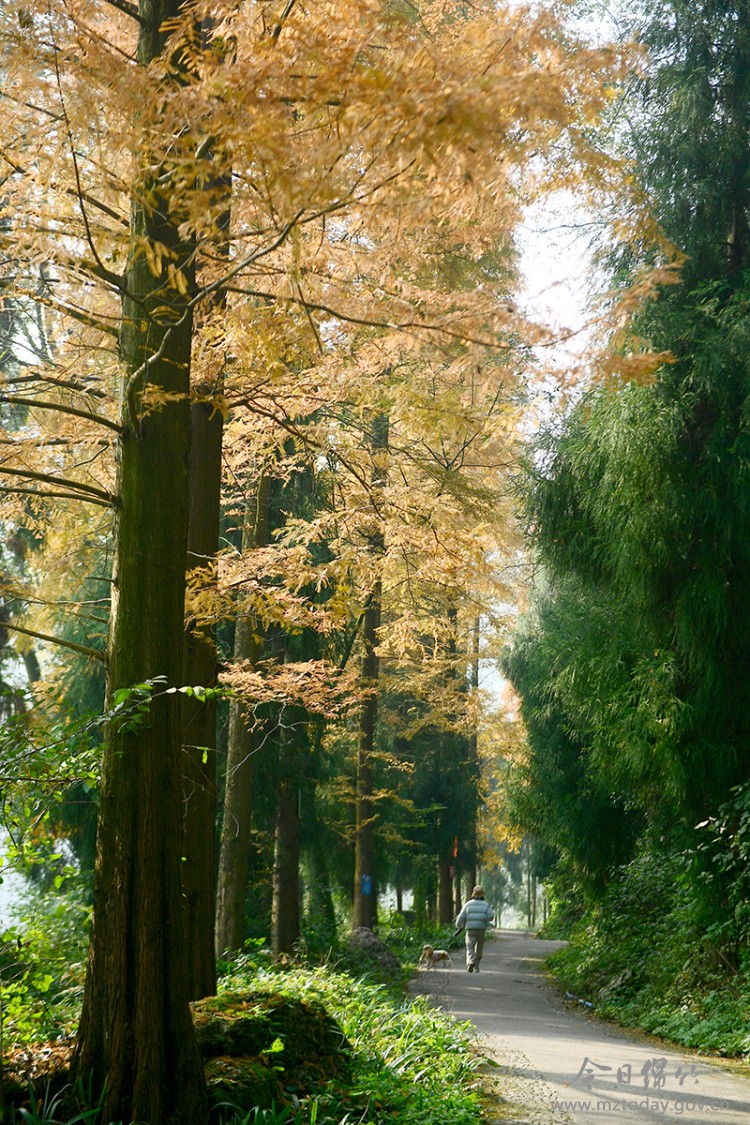 与坝边柔美的芦苇相映成趣的,是岸边挺拔的水杉林。它们的叶子在低温的催化下,完成了从翠绿到赭红再到锈色的蜕变。阳光透过这些红褐色的、略显稀疏的枝叶,在地上投下斑驳陆离的光影,踩上去,仿佛能听到时光碎裂的清脆回响。 在这片静谧的色彩与光影中,水面被惊起一丝涟漪。是野鸭,它们三五成群,时而悠闲地拨动清波,留下一道道渐散的水痕;时而一个猛子扎下去,只留一圈圈涟漪在水面荡漾;时而又扑棱着翅膀低空飞过,为这幅静谧的画卷添上最灵动的笔触。