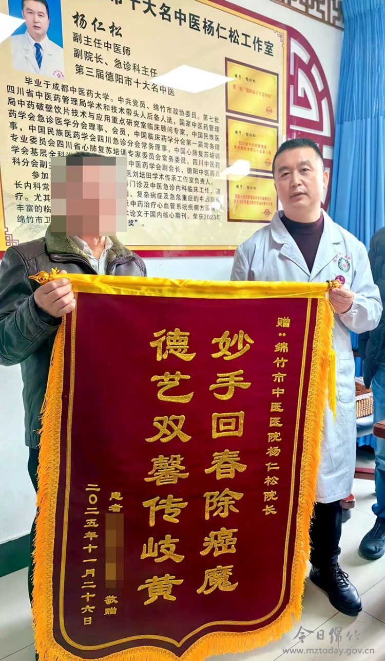 据了解,吴先生两年前因食管癌接受了手术治疗。术后,他不仅身体长期处于虚弱状态,体力恢复缓慢,还面临着消化功能减弱、进食不畅等问题,日常生活质量受到不小影响。杨仁松接诊后,没有简单套用常规调理方式,而是先通过详细问诊、辨证分析,全面掌握吴先生的术后身体机能、饮食作息等情况,并结合中医药 “辨证施治、整体调理” 的核心优势,为他量身定制了以 “益气扶正、软坚散结” 为主的个体化中药调护方案。 “我一方面运用健脾和胃类中药,改善他的术后消化功能,缓解进食不适;另一方面通过扶正固本方剂,系统增强免疫力,帮助其逐步恢复体力。”杨仁松说,在治疗过程中,他还根据吴先生身体的变化和反馈,及时调整药方和剂量,确保治疗方案的精准性和有效性。 在杨仁松的精心治疗下,吴先生的身体状况逐渐有了明显改善。原本虚弱无力的身体,慢慢有了力气,能进行一些简单的日常活动。进食不再像以前那样困难,胃口也好了不少。随着身体的好转,吴先生的精神状态也焕然一新,生活质量得到显著提升。“多亏了杨医生,他不仅医术高明,还特别耐心,每次问诊都仔仔细细,给我解释病情和治疗方案,让我心里有了底。现在能吃能睡,身体好多了。”患者吴先生感慨道。 一面锦旗,不仅承载着患者及家属的肯定与信任,更有力印证了市中医医院在中医药应用于肿瘤术后康复领域所取得的临床效果。市中医医院将继续深耕中医药特色优势,不断提升临床诊疗水平,努力为广大群众健康贡献更多中医智慧与力量。 (图片由市中医医院提供)