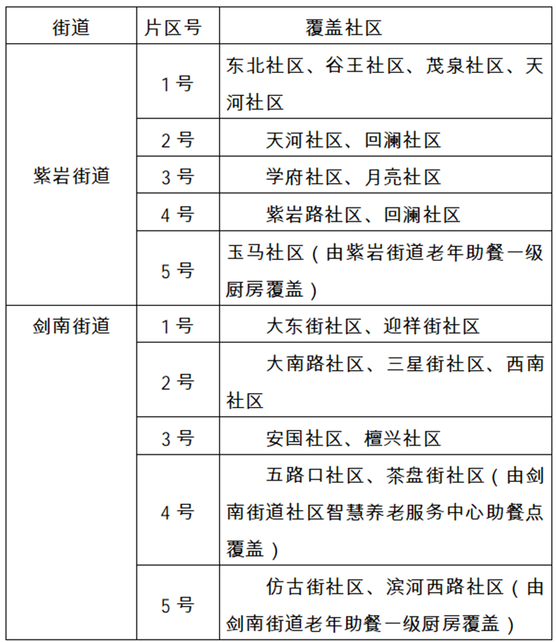为加快构建全市老年助餐服务体系,进一步优化我市老年助餐服务网络,根据《绵竹市老年助餐建设实施方案》,现面向社会公开招募7个老年助餐点。现将有关事项通告如下: 一、招募计划 所在位置符合“绵竹市老年助餐片区划分表”的社会化助餐点主动联系所在片区的社区进行申报,已建设或拟建设一级厨房的片区原则上不再评选社会化助餐点开展助餐服务,同一片区最终仅选择一家社会化助餐点实施为老助餐服务,片区划分情况见下表。