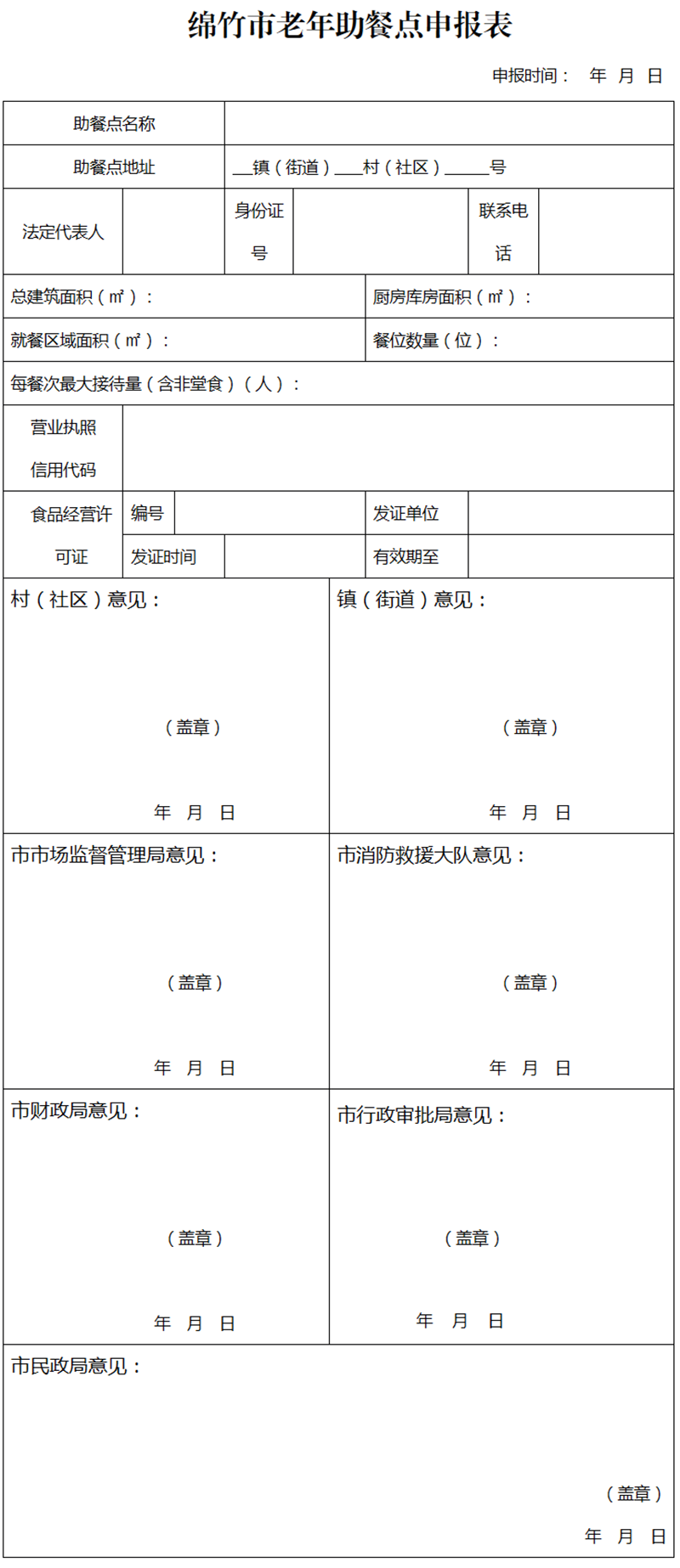 二、申报时间、申报资料、申报地点 (一)申报社会化助餐点提交资料时间 2025年12月5日至12月15日。 (二)申报资料 ①绵竹市2025年老年助餐点申报表(附件1);②营业执照(复印件);③食品经营许可证(复印件);④所有从业人员的《健康证》复印件;⑤绵竹市老年助餐点食品安全承诺书(附件2);⑥助餐套餐和价格表;⑦食品安全责任险保单复印件;⑧产权证或租赁协议复印件。 (三)申报地点 社会化助餐点所在地社区居委会。 三、申报要求 社会化助餐点应符合《绵竹市老年助餐建设实施方案》中关于“规范准入资格”的相关要求,即: (一)申报老年助餐点场所应满足救护车和消防车可出入,具备独立法人资格、食品经营许可证、购买食品安全责任保险。 (二)申报单位老人就餐区应布置在1层,若设置在2层及以上应配备电梯,且至少一台能容纳担架,老年助餐点面积应不少于80平方米,可容纳30人同时就餐。 (三)申报单位应提供老年助餐套餐和价格表。所提供的老年餐应低于市场平均价格,菜品应符合老年人日常饮食习惯,满足“卫生、健康、丰富”的要求,早餐、午餐、晚餐须提供至少3种价格(须有一种价格满足老人享受补贴的最低消费标准)、每种价格至少含3种品类的套餐,能够满足老人单人单次的不同就餐需求。助老套餐须经市民政局备案并同意方可售卖,不得提供盒装牛奶等未经加工、制作的商品。 (四)申报单位应具有与食品经营制售相适应的场所、设施和设备,布局合理,要满足《中华人民共和国食品安全法》《餐饮服务通用卫生规范》(GB31654-2021)《餐饮服务食品安全操作规范》《集中用餐单位落实食品安全主体责任监管管理规定》等有关要求,且符合行政审批部门和市场监管部门的相关规定。从事服务的工作人员应持有有效期内的健康证,做好食品留样,加工过程生熟分开,做好餐饮具清洗消毒,食品采购应定点,如实填写进货查验记录台账,索取并留存各类食品进货凭证单据和检验合格证明,确保食品来源的可追溯性,三年内未受到过涉及食品安全方面相关的行政罚款、治安处罚、刑事处罚,且三年内未发生过重大食品安全事故。 (五)申报单位消防安全技术条件、消防安全责任、消防安全管理应符合要求,根据国家的技术规范标准配置消防器材和消防设施,并遵守消防法律法规的相关要求,三年内未发生过较大及以上消防安全事故。厨房不得使用瓶装液化石油气。 (六)申报单位在被确认为老年助餐点之后,须配合民政部门对其进行适当改造、加装助餐系统和视频监控等,悬挂统一的标识标牌。 (七)申报单位被确认为老年助餐点1个月内,实施为老助餐服务前须通过开业前消防安全检查许可,并取得消防部门出具的《公众聚集场所投入使用、营业前消防安全检查意见书》。 绵竹市民政局 2025年12月4日 附件1