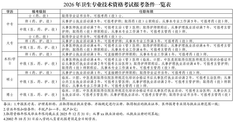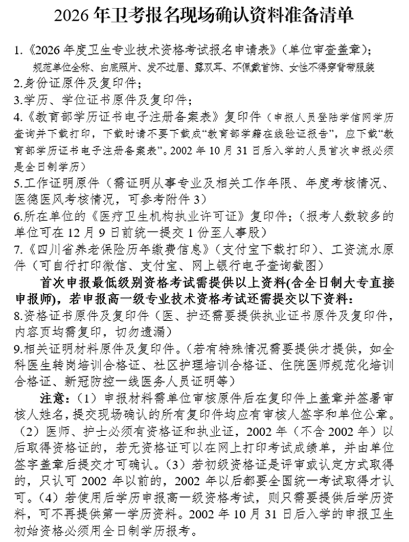 各医疗卫生健康单位、民营医疗机构、企事业单位医务室、村卫生站、诊所: 现将《关于做好2026年度卫生专业技术资格考试工作的通知》转发至各单位,并就相关工作做补充说明,请各单位认真组织实施。 一、现场确认时间为2025年12月10日-2025年12月17日(工作日上午9:00-11:30:下午2:30-5:00),地点为绵竹市卫健局四楼会议室(绵竹市剑南街道大南路402号)。 二、根据2026年卫考报名现场确认相关工作要求,按照报考年限要求,请单位注意审核。具体要求见《2026年卫生专业技术资格考试报考条件一览表》(附件1)。 三、请各单位协助并通知需现场确认人员做好相关确认资料的准备工作。资料准备清单见附件2。 绵竹市卫生健康局 2025年12月5日