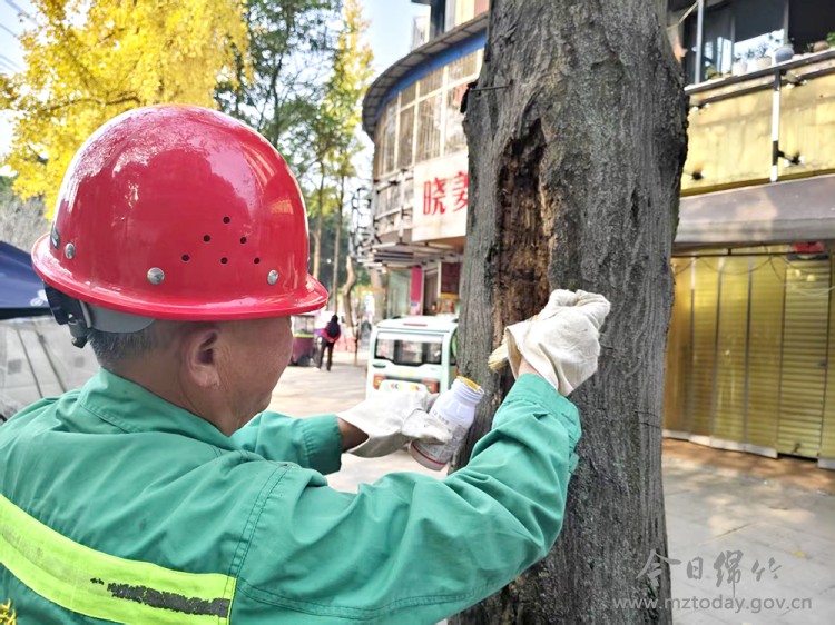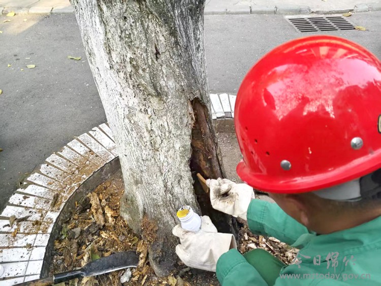 接到市民反映后,市综合行政执法局高度重视,第一时间响应群众关切,立即组织专业技术人员前往现场进行“会诊”。“三棵树”品种为构树,栽种于道路通行范围内,其根系生长空间已完全被水泥硬化路面封闭。而且,构树极易遭受天牛侵害,多年前,其中一株树就因病害被锯除。如今,又有一棵出现了严重虫害侵蚀,导致树干受损、树皮开裂、木质部腐朽等情况发生。 “虫害已严重威胁树木的结构安全与营养输送。”市综合行政执法局园林所负责人陈刚告诉记者,为科学救护和延长老树的生命,园林所结合树木生长状况,制定了针对性强、措施完备的综合复壮方案。通过对腐朽部位进行清创和防腐处理,促进伤口愈合,并持续进行病虫害防治,系统控制虫源,保护新生组织。同时,进行科学缩冠修剪,减轻树干负重,平衡根冠比例,促进新枝萌发,逐步恢复树势。
