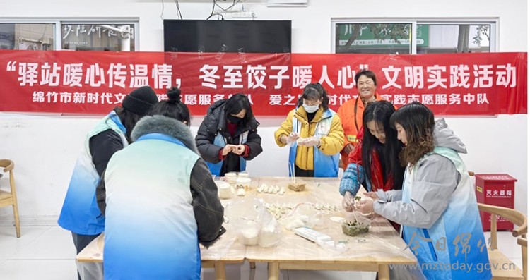 12月21日,冬至。为让传统节气文化融入百姓生活,让坚守岗位的户外劳动者感受到城市温度,绵竹市新时代文明实践中心办公室联合爱之援义工协会在滨河路劳动者驿站举行了“驿站暖心传温情 冬至饺子暖人心”主题文明实践活动,为一线环卫工人、快递员等户外劳动者送上冬日关怀。