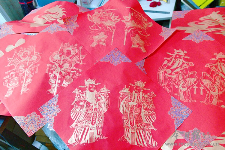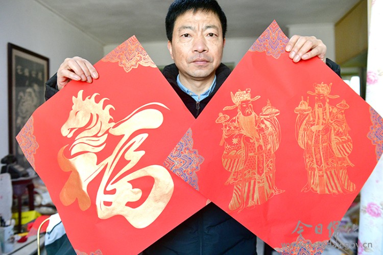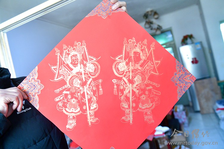 技术攻关:攻克材料与工艺 创新绝非简单的缩小画面。陈健经过长达十余年的反复试验,才最终攻克了纸张和颜料的难关。他选用定制的蜡染万年红斗方纸,研发出色彩鲜艳持久的颜料,并运用独特的印金工艺,使画面上的印金色彩具有反光效果,既鲜艳夺目又历久弥新。 在传统门神造型基础上,他通过巧妙的色彩与构图设计,将两位门神和谐地融入一幅45厘米见方的画幅中,创作出《双扬鞭》《立锤武将》等“单门版”门神,以及适合室内的《文武加官》《双鹤同庆》、马年的福字等系列作品。