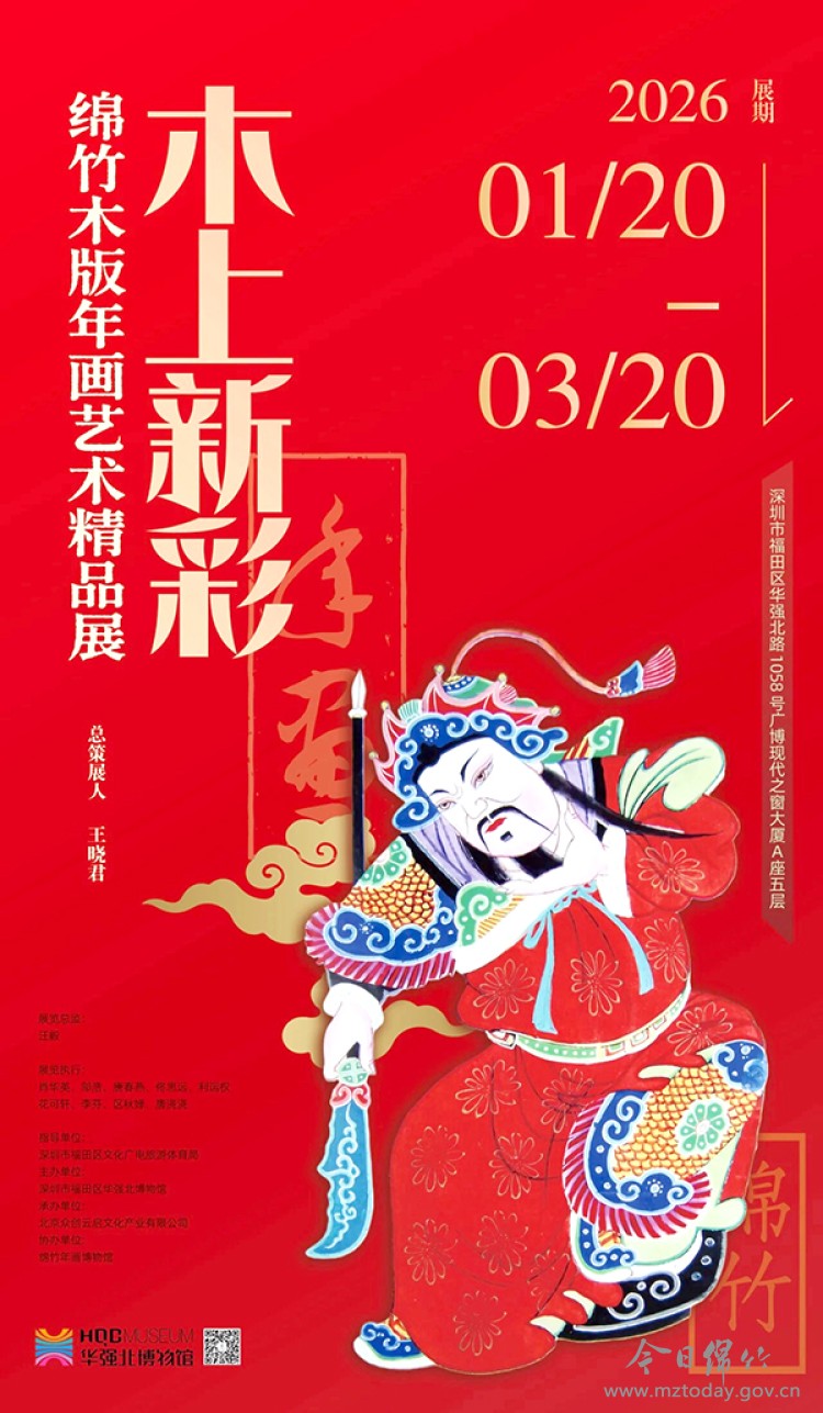 1月20日,由深圳市福田区文化广电旅游体育局指导、深圳市福田区华强北博物馆主办、北京众创云启文化产业有限公司承办、绵竹年画博物馆协办的“木上新彩——绵竹木版年画艺术精品展”在深圳市福田区华强北博物馆启幕。此次展览将持续至3月20日。