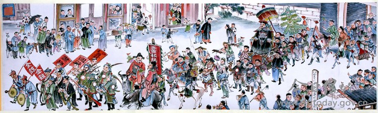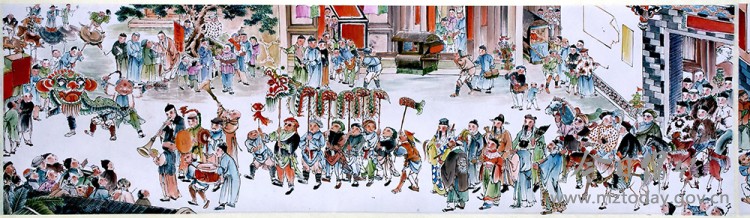 2月4日至3月20日,“迎春——绵竹年画的年俗与新韵”主题展将在北京中国非物质文化遗产馆举办。本次展览将展出100余幅精品绵竹年画,既有传统年画的经典呈现,也有创新作品的当代演绎。日前,记者走进绵竹年画博物馆,以《迎春图》《双扬鞭》《三星高照》《百寿图》《三猴烫猪》《骑车仕女》等多幅绵竹年画经典作品为载体,带领大家领略绵竹年画的历史脉络与技艺精髓。 春节史诗:《迎春图》 清代绵竹画家黄瑞鹄创作的《迎春图》,被誉为“蜀中的《清明上河图》”。该作品以绵竹老城为背景,生动刻画了清代社会各阶层人物460余人,全景式描绘“迎春、报春、游春、打春”系列节俗,再现了传统新春的欢腾景象与民俗风貌。