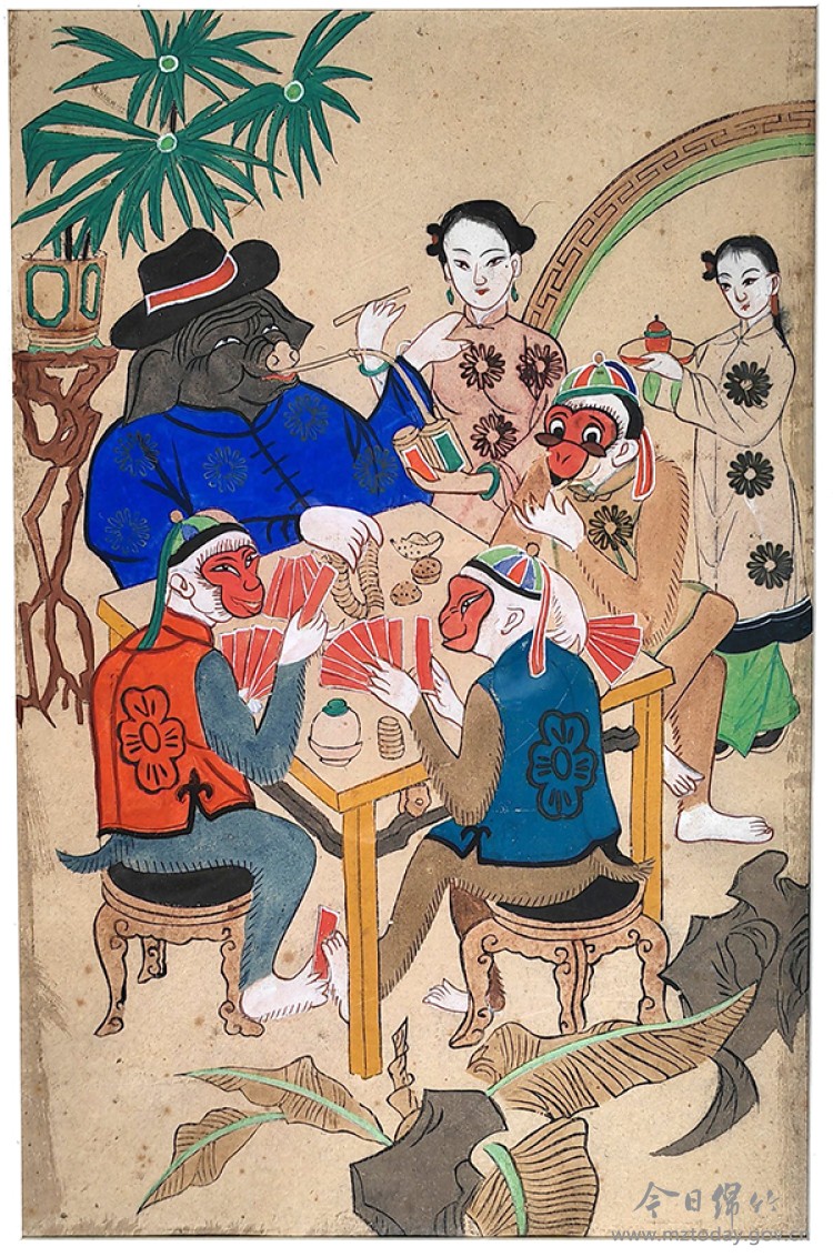 更妙的是几位“不服老”的寿星:或灵巧攀树,或稳骑鹿背,动静之间洋溢着生命的活泼;至于那些骑鹤乘云、飘然云端的老人,则已透出仙风道骨,仿佛在笔墨间完成了从人间到仙界的诗意过渡。整幅长卷不仅是对“长寿”的祝愿,更是一曲对生命丰盈与精神自由的生动礼赞。 斗方戏韵:《三猴烫猪》《骑车仕女》 《三猴烫猪》是传统绵竹年画中颇具特色的讽刺小品。画面中,三只狡猾的猴子和一只富态的猪围坐在方桌边,正在玩纸牌赌博,桌面上堆满赌资。在猪的身旁,侍立着两名窈窕少女,为它端茶、递旱烟。三只猴子串通一气,趁着猪用手调戏少女之际,暗中在桌下用脚传递纸牌作弊,神不知鬼不觉地赢掉猪的钱,把猪“烫”得够呛。