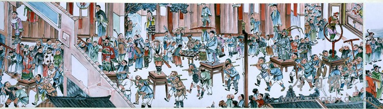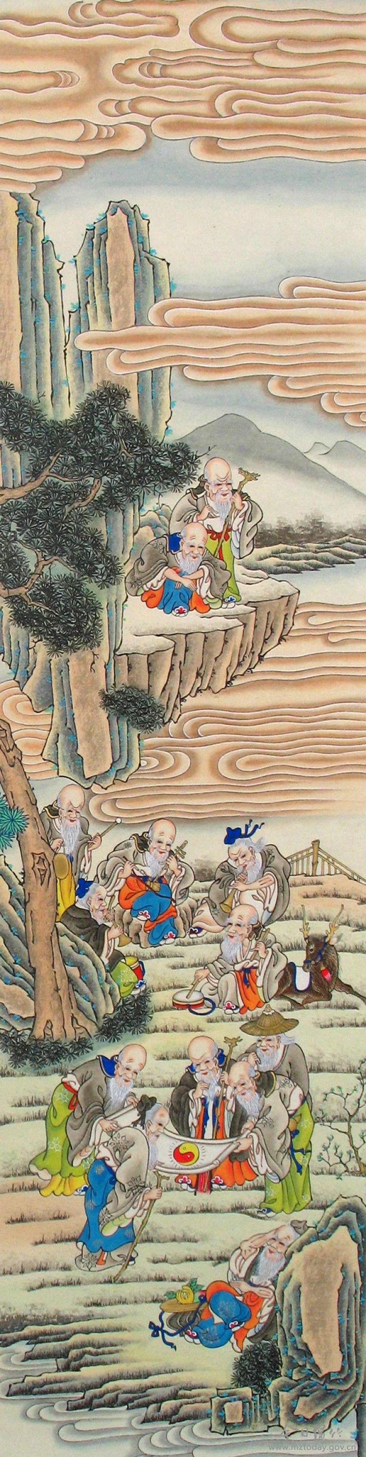 画中通常以禄星为中心,福星与寿星分列左右,构图稳重对称。禄星头戴官帽,手持如意,象征着功名与财富;福星常怀抱童子,身旁多子,象征着幸福与好运;寿星额高长须,象征着健康与长寿。画中除了绘有福星、禄星、寿星外,还绘有天真可爱的儿童(即喜童),故称《福禄寿喜图》。 《百寿图》是绵竹年画中经典的条屏画作品,为光绪年间绵竹著名画师孟世康的代表作,也是传统“福禄寿”吉祥题材的经典体现。 全图共八幅,合计绘一百个栩栩如生的百岁老人,故名《百寿图》。画家以充满想象力的笔触,将长寿者的晚年生活描绘得逸趣横生、境界迭出。草地上,老寿星们宴饮野餐,划拳行令,欢声笑语间尽是人间烟火;一旁有人围坐“摆围鼓”,清唱川戏,声韵悠长;也有人沉浸于抚琴对弈,或悠然江边垂钓,甚至三两相聚,戏作互搔背之乐,稚态可掬。