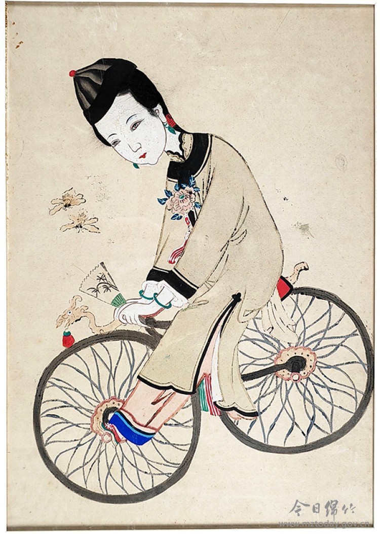 这幅作品创作于晚清时期。当时,自行车作为最时髦的西洋“舶来品”,刚进入中国不久,是摩登、开放与新生活方式的象征。作画的绵竹年画艺人从没有亲眼见过真正的自行车,只靠他人描述想象落笔,创作出了这幅让人耳目一新的作品,生动记录了社会转型时期民众对新鲜事物的好奇与接纳。