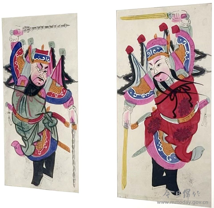 在艺术方面,《迎春图》融合了细腻的工笔和年画装饰线条,人物须发、衣饰纹理精微可辨,色调以红黄为宗,烘托吉庆氛围,且服饰、建筑皆合清代典制,构图严谨,笔精色妙。在文化方面,此作为国内仅见全景式表现“迎春”民俗的年画长卷,填补了传统农耕社会节庆活动的图像记载空白,为当代人理解“年画里的中国年”提供了鲜活的历史视窗,被评定为国家一级文物。 门神守岁:《双扬鞭》 《双扬鞭》的源头,可追溯至一个广为流传的唐代传说。相传唐太宗李世民因噩梦惊扰,夜不能寐,大将秦琼与尉迟恭自愿披甲执锐,夜守宫门,邪祟果然不再侵扰。为了让爱将休息,太宗命人绘制二人戎装画像贴于宫门,同样奏效。这个“昔为皇宫镇邪,今佑百姓万家”的故事从此在民间流传,秦琼与尉迟恭也逐渐演变为最深入人心的门神形象。