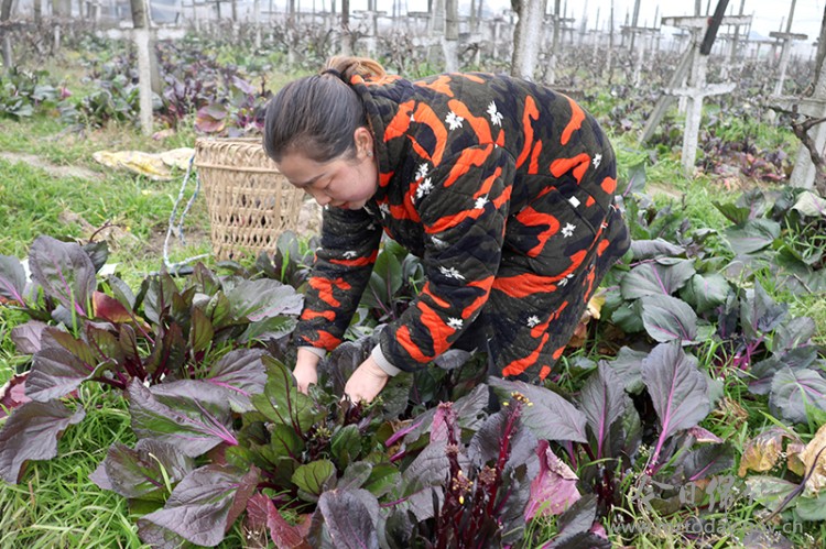 眼下,寒意至盛,在紫岩街道广和村的连片葡萄园内,却别有一番生机。葡萄藤蔓进入休养期,而垄间的土地并未就此沉睡,一片片茂盛的红菜苔鲜嫩欲滴。该村种植户王文英巧妙利用葡萄种植冬闲的“空档期”,错季种植蔬菜,用“葡萄+蔬菜”的农业套种模式,实现了一田双收,提质增效。