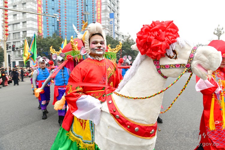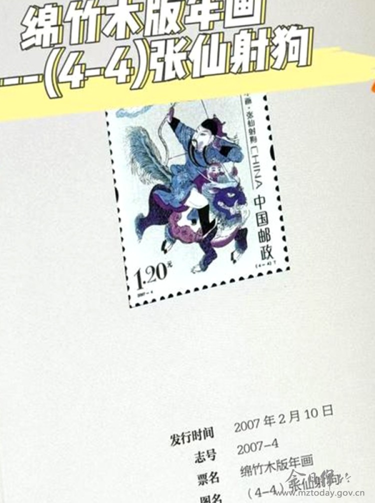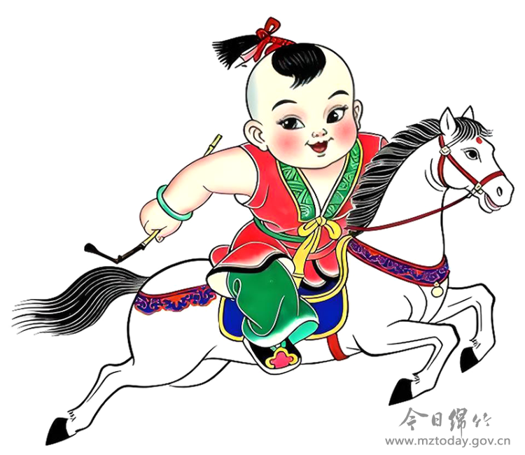 在绵竹年画的传世佳作中,马的意象多与英雄、神只相伴,画面充满动感与故事性。例如,清光绪年间的作品《穆桂英》,便生动描绘了这位杨家女将跃马披甲、驰骋沙场的英姿,彰显其智勇双全的形象。另一幅清中期的经典作品《张仙射狗》(亦称《张仙射天狗》),则描绘了民间祈子之神张仙骑在神兽之上,张弓搭箭为儿童驱邪避祸的场景。画面构图饱满,动感十足。 绵竹年画的魅力不仅停留在故纸堆中,更活态传承于热烈的民俗活动中。每年农历春节前后举办的绵竹年画节上,大型巡游是重头戏。巡游队伍常依据清代名画《迎春图》中的场景进行装扮,其中“骑牛的春官”等形象,与年画中常见的鞍马意象一脉相承,共同构成了绵竹人民欢庆新春的盛大画卷。