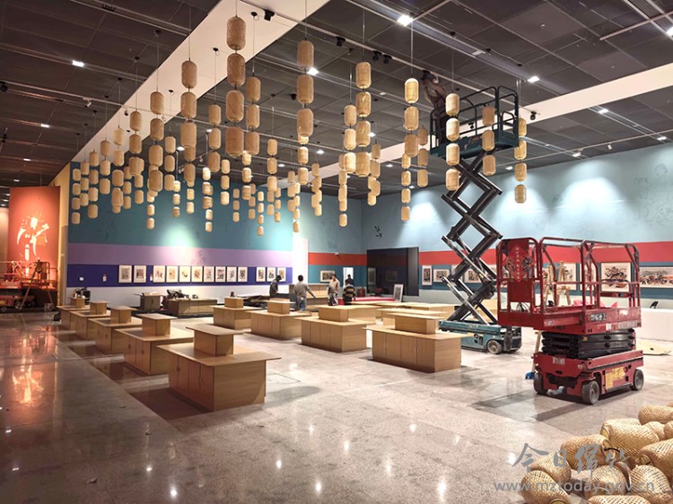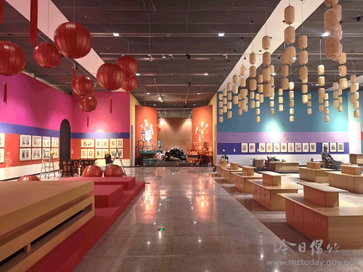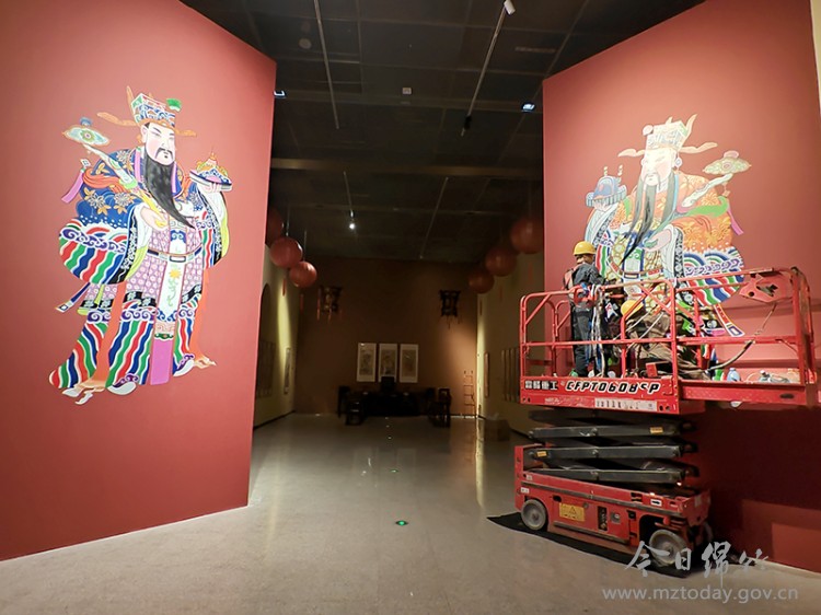 1月28日,中国非物质文化遗产馆内,一盏盏红、黄灯笼自天花板层层垂挂,场馆内色调明艳亮眼,浓浓的新春年味扑面而来。绵竹年画博物馆的工作人员各司其职、配合有序,加紧搭建展架、布置场景,同时精心绘制巨幅门神年画,为展览顺利开幕做好各项准备工作。