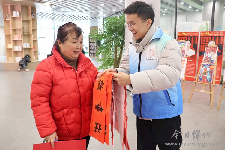 活动现场,市书法家协会的老师们专注创作、挥毫泼墨,为市民书写饱含祝福的春联与“福”字;志愿者们则主动协助,将一副副墨迹未干的春联与“福”字细心晾干、分类整理。随后,志愿者们分组协作,不仅为现场参与活动的群众送上了春联与“福”字,还将这份“手写的温暖”送给读书区正在阅读的读者,让翰墨香气伴随书香,传递到馆内每一个角落。