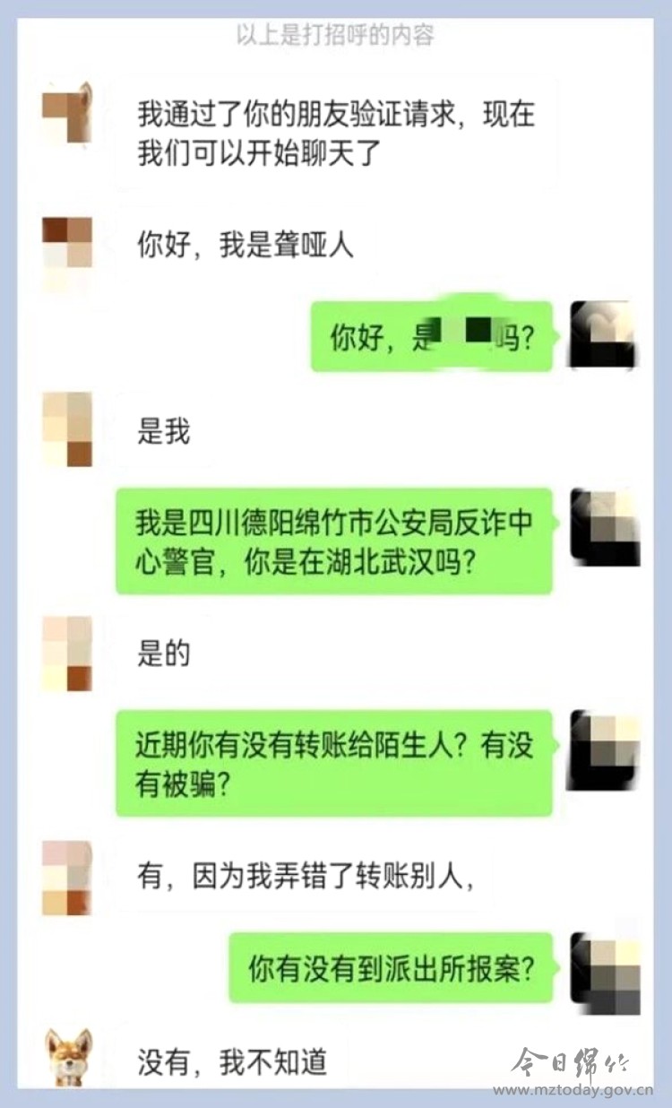2025年6月16日,绵竹反诈中心接到银行紧急预警:客户张某的账户刚收到一笔12000元陌生转账,准备在柜台全额取现。“我不认识转账人。”面对银行工作人员的询问,张某一脸茫然。 反诈民警迅速展开调查,发现转账方黄某的账户已被外地警方监管,这意味着黄某极有可能正遭遇诈骗,必须尽快阻断转账。然而黄某电话始终无法接通。“受害人很可能已被骗子深度洗脑,甚至被恐吓不得接听电话。”民警转而通过微信添加黄某好友,几分钟后申请通过。