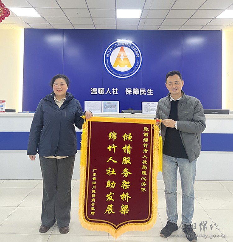 2月3日上午,德阳市驻广东返乡创业和劳务输出服务联络站负责人、广东省四川德阳商会秘书长刘波来到绵竹市人社局,送上一面写着“倾情服务架桥梁 绵竹人社助发展 ”字样的锦旗,感谢该局长期以来对在广东务工的绵竹籍农民工在政策对接、就业创业支持、关爱帮扶等方面的务实举措。