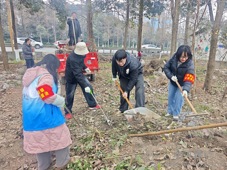 在茶店子村和桂兰村,工作人员与志愿者们对环境卫生进行了地毯式清理,大家手持铲子、夹子、扫帚等工具分工协作,在道路两侧和树林中捡拾白色垃圾、枯枝败叶,全方位清理卫生死角,让绿地重现整洁生机。“马上就要过年了,把家门口打扫得干干净净,看着就舒心,住着也舒服。”茶店子村村民张文财说。