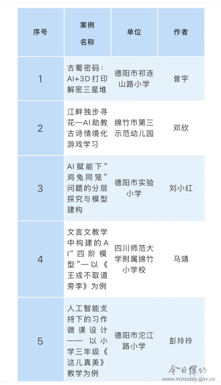 近日,教育部教育技术与资源发展中心(中央电化教育馆)公布了2025年教师人工智能应用案例征集活动结果。四川师范大学附属绵竹小学校老师马靖的人工智能应用案例《文言文教学中构建的AI“四阶模型”——以<王戎不取道旁李>为例》和绵竹市第三示范幼儿园老师邓欣的人工智能应用案例《江畔独步寻花——AI助教古诗情境化游戏学习》榜上有名。