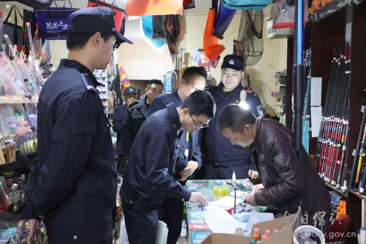 在飞云街一家渔具店内,联合执法小组一边检查货架上的商品,一边向经营者发放禁渔宣传单,告知从3月1日0时至6月30日24时,绵竹市境内所有天然水域均禁止包括垂钓在内的所有形式的捕捞行为。