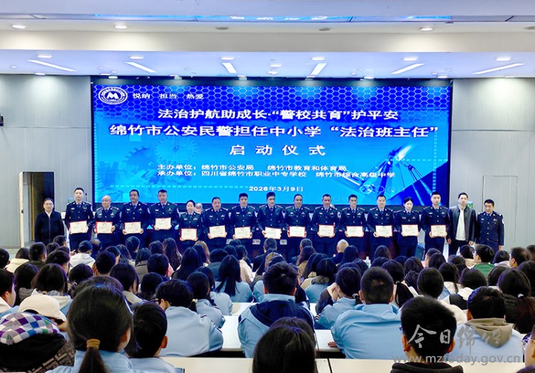 为了进一步深化警校共育、筑牢校园安全防线,3月9日,绵竹市公安民警担任中小学“法治班主任”启动仪式在绵竹市职业中专学校举行,标志着我市在推动法治教育进校园、进班级、进心灵方面迈出了坚实步伐。