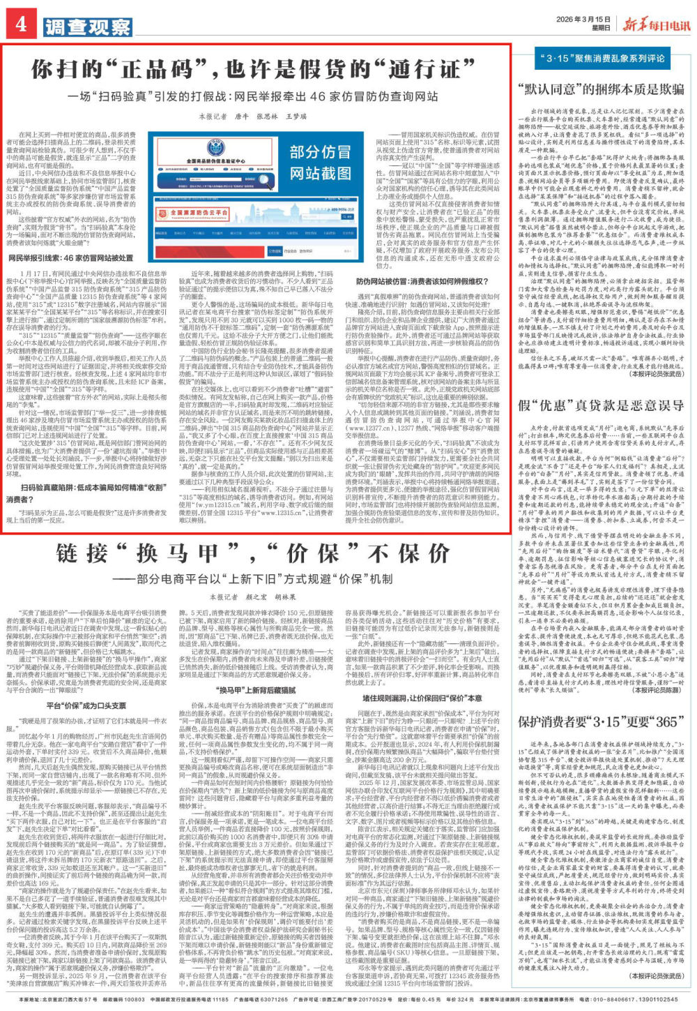 网民举报引线索:46家仿冒网站被处置 1月17日,有网民通过中央网信办违法和不良信息举报中心(下称举报中心)官网举报,反映名为“全国质量监督防伪系统”“中国产品监督315防伪查询系统”“315产品防伪查询中心”“全国产品质量12315防伪查询系统”等4家网站,使用“315”或“12315”数字注册域名,网站内容展示“国家某某平台”“全国某某平台”“315”等名称标识,并在搜索引擎上进行推广,通过定制所谓的“国家级溯源防伪标签”牟利,存在误导消费者的行为。 “315”“12315”“质量监督”“防伪查询”——这些字眼在公众心中本是权威与公信力的代名词,却被不法分子利用,作为收割消费者信任的工具。 举报中心工作人员陈超介绍,收到举报后,相关工作人员第一时间对这些网站进行了证据固定,并将相关线索移交给市场监管部门进行核查。经核查发现,上述4家网站均非市场监管系统主办或授权的防伪查询系统,且未经ICP备案,违规使用“中国”“全国”“315”等字样。 这意味着,这些披着“官方外衣”的网站,实际上是彻头彻尾的“李鬼”。 针对这一情况,市场监管部门“举一反三”,进一步排查梳理出46家涉及境内仿冒市场监管系统主办或授权的防伪系统查询网站,违规使用“中国”“全国”“315”等字样。目前,网信部门已对上述违规网站进行了处置。 “这次处置涉‘315’仿冒网站,既是网信部门管网治网的具体措施,也为广大消费者提供了一份‘避坑指南’。”举报中心受理处置一处处长刘涵说,下一步,举报中心将持续做好涉仿冒假冒网站举报受理处置工作,为网民消费营造良好网络环境。 扫码验真藏陷阱:低成本骗局如何精准“收割”消费者? “扫码显示为正品,怎么可能是假货?”这是许多消费者发现上当后的第一反应。 近年来,随着越来越多的消费者选择网上购物,“扫码验真”也成为消费者收货后的习惯动作。不少人看到“正品验证通过”的提示便信以为真,殊不知自己早已落入不法分子的圈套。 更令人警惕的是,这场骗局的成本极低。新华每日电讯记者在某电商平台搜索“防伪标签定制”“防伪系统开发”,发现只用不到30元就可以买到1000枚一码一物的“通用防伪不干胶标签二维码”,定制一套“防伪溯源系统”也仅需几千元。这给不法分子大开方便之门,让他们能批量造假、轻松仿冒正规防伪验证体系。 中国防伪行业协会秘书长隆亮提醒,很多消费者混淆了二维码与防伪码的概念。“产品包装上的普通二维码一般用于商品流通管理,只有结合专业防伪技术,才能具备防伪功能。”而不法分子正是利用这种认知误区,谋划了“假码验假货”的骗局。 在社交媒体上,也可以看到不少消费者“吐槽”“避雷”类似情况。有网友发帖称,自己在网上购买一款产品,价格是官方旗舰店的一半,扫码验真时却发现,二维码对应验证网站的域名并非官方认证域名,而是来历不明的跳转链接,存在安全风险。一位网友购买某款化妆品后扫描盒体上的二维码,弹出“中国315商品防伪查询中心”网站并显示正品,“我又多了个心眼,在百度上直接搜索‘中国315商品防伪查询中心’网站,一看,‘不存在’”。还有不少网友反映,即便扫码显示“正品”,但商品实际使用感与正品相差甚远,无奈之下只能在社交平台发文提醒:“别以为扫出来是‘真的’,就一定是真的。”