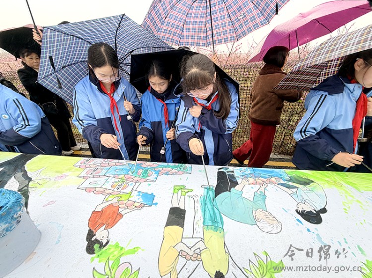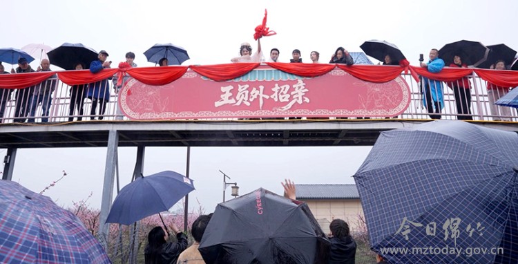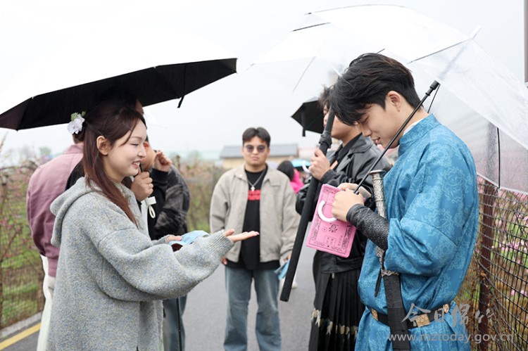 全民八段锦展演在桃林广场准时开演,老少同台,一招一式舒展有力,与身旁的灼灼桃花、清新空气相融,尽显康养与春日的和谐;百米乡村振兴长卷前,大家齐执画笔,将对田园生活的热爱、对乡村振兴的期盼绘入长卷,勾勒出产业兴旺、生态宜居的美好图景;心形桃花廊道上,“王员外招亲”的趣味情景剧热闹非凡,王员外携家眷抛绣球招亲,抢到绣球的游客现场“拜堂”,还能收获桃花券等特色“嫁妆”,沉浸式体验传统文化的乐趣。NPC穿着精致的古装,在桃林间演绎着趣味民俗小故事,游客可以从“看客”现场变成“剧中人”,玩得不亦乐乎。 “早听说文永村的桃花有意思,没想到不仅花好看,互动游戏也很好。”游客薛晓玲手捧鲜花,一脸笑意。她说,细雨中的桃园不仅有美景可赏,更有丰富的体验项目可玩,大家在赏花游玩中尽情享受着春日乡村游的乐趣。