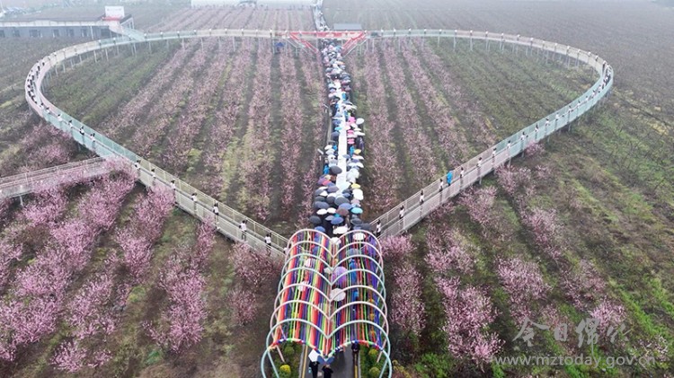 这场为期3天的春日盛会,不只是一场看花打卡的休闲之旅,更是富新镇以花为媒,激活“春日经济”、推动农文旅深度融合的生动实践。 沉浸式赏玩 解锁春日浪漫新体验 近年来,文永村的百亩桃林已成为不少市民和游客的“心头好”。尽管绵绵春雨,但依旧挡不住大家踏青赏花的热情。雨雾中的桃林既有诗意朦胧,又有烟火热闹,粉白花瓣缀满枝头,沾着晶莹雨珠,更显娇嫩欲滴。撑伞漫步在心形桃花廊道,烟雨朦胧与花海烂漫交织成一幅绝美的春日画卷。游人或牵手漫步、驻足拍照,或沉浸式参与各项特色活动,欢声笑语在桃林间久久回荡。
