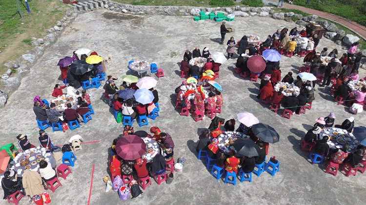 临近中午,一年一度的“坝坝宴”热闹开席。热气腾腾的乡村美食摆满圆桌,乡亲邻里与各地游客围坐在一起,开心地举起酒杯,同品可口美食,共饮和谐美酒,欢声笑语不绝于耳。