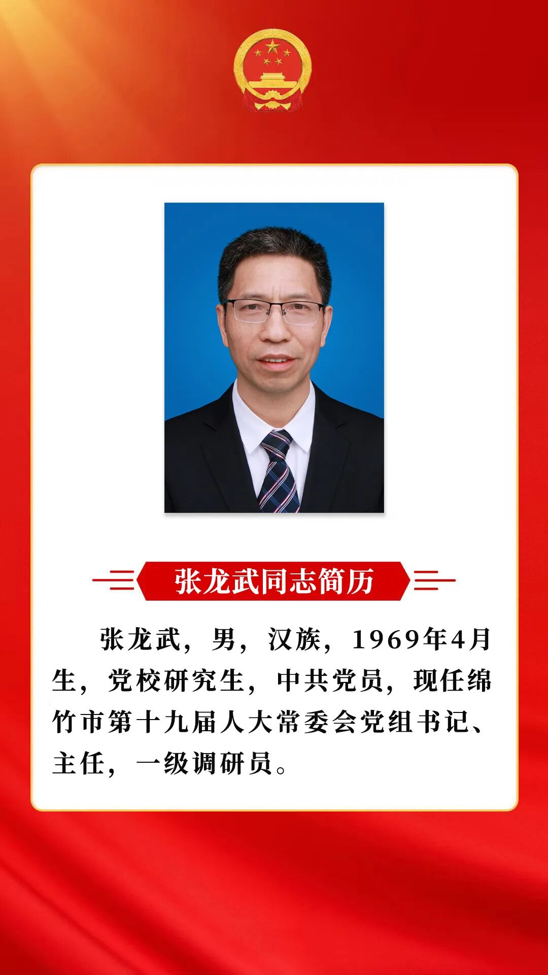 在3月24日上午举行的绵竹市第十九届人民代表大会第七次会议第二次全体会议上,张龙武当选为绵竹市第十九届人民代表大会常务委员会主任。