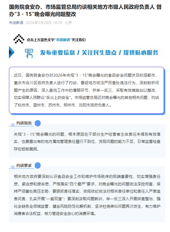 原标题:国务院食安办、市场监管总局约谈相关地方市级人民政府负责人 督办“3・15”晚会曝光问题整改 近日,国务院食安办对2026年央视“3・15”晚会曝光的食品安全问题涉及的成都市、重庆市合川区政府负责人进行了约谈,督促地方依法严厉查处违法行为,深刻剖析问题产生的原因,深入查找工作中的薄弱环节,并举一反三,采取有效措施加以整改,切实保障人民群众“舌尖上的安全”。市场监管总局还对晚会曝光的其他相关问题,约谈了杭州市、温州市、苏州市、郑州市、沈阳市政府负责人。 约谈指出 央视“3・15”晚会曝光的问题,根本原因在于部分生产经营者主体责任未得到有效落实,也暴露出有的地方属地管理责任履行不到位,发现问题的能力不足,日常监督检查存在短板漏洞。 约谈要求 相关地方政府要深刻认识食品安全工作和维护市场秩序的极端重要性,切实增强责任感、紧迫感和使命感,严格落实“四个最严”要求,对晚会曝光的问题依法深挖彻查,保持严惩重处高压态势;要狠抓责任落实,依规依纪依法对相关责任单位和责任人严肃追责问责,扎实开展“一案双查”;要深刻汲取问题教训,举一反三深入开展排查整治,强化全链条全领域监管,健全风险防范化解机制,坚决杜绝类似问题再次发生,有力维护消费者合法权益,努力营造安全放心的消费环境。