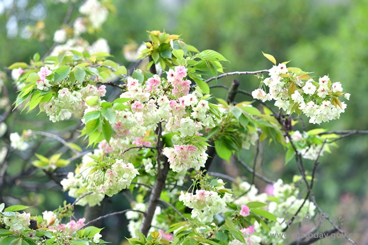 记者在现场看到,盛开的樱花以粉红色为主,花瓣层叠繁复,簇拥枝头,远望如云似霞。尤为引人注目的是数株开有绿白色花朵的樱花,花瓣轻薄如绸,在阳光映照下泛着柔和的光泽,与周围的粉樱相映成趣,别具一番清雅韵味。