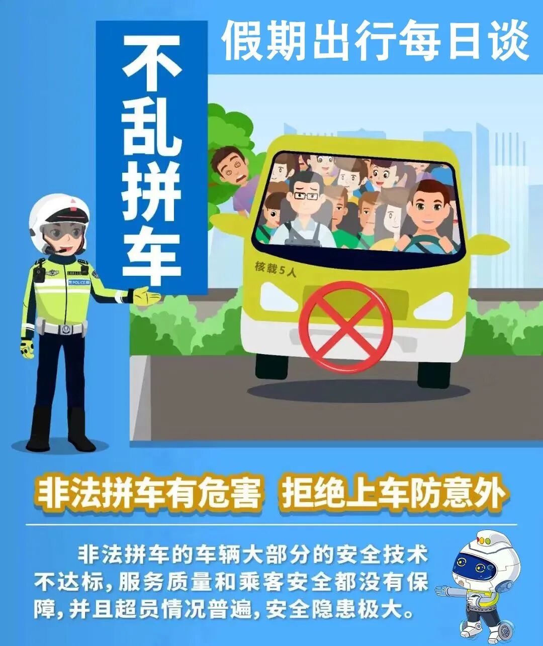 安全提示 拒绝非法拼包车! ![]() 为了方便通过微信群、QQ群、老乡电话介绍等方式拼车出行,为一些车辆参与非法营运提供了空间。 非法拼包车,车辆超员现象普遍