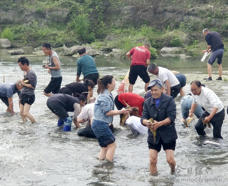 上午10点30分,趣味抓猪活动正式开始,宽阔的河滩瞬间人声鼎沸。一只只小猪在场地内欢快奔跑,参赛选手挽起衣袖、弯腰追逐,时而屏息靠近,时而快步合围,尖叫声、欢笑声、加油声此起彼伏。在不远处的浑水摸鱼区,随着裁判的一声令下,市民和游客们纷纷卷起裤腿,化身“捕鱼达人”,在河水中小心翼翼地摸索、追逐。有人刚摸到鱼,鱼儿就“哧溜”一声从手中挣脱掉进田里,溅得一身泥水,引来围观者一阵哈哈大笑。