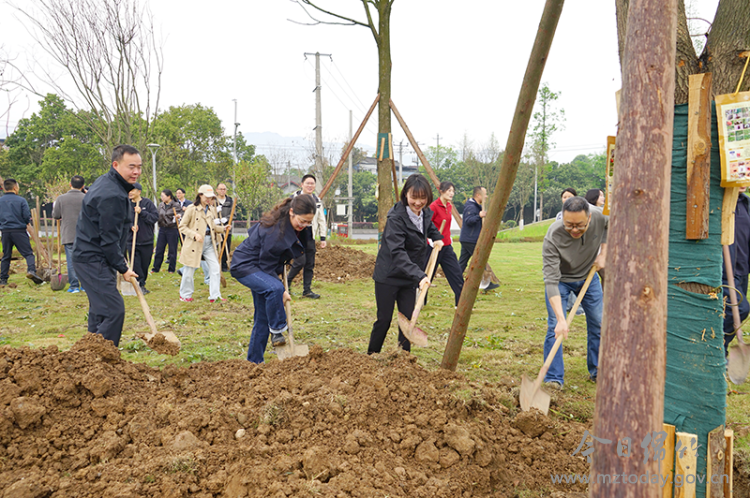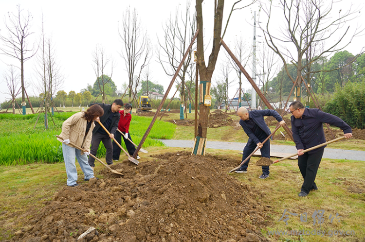 植树活动现场一派热火朝天的景象。欧阳荣书与劳模代表三五一组、分工协作,挥锹培土、踩实根基,精心栽下一株株苗木。经过一番辛勤劳作,40株挺拔的香樟树迎风而立,为绵竹大地再添一片新绿。