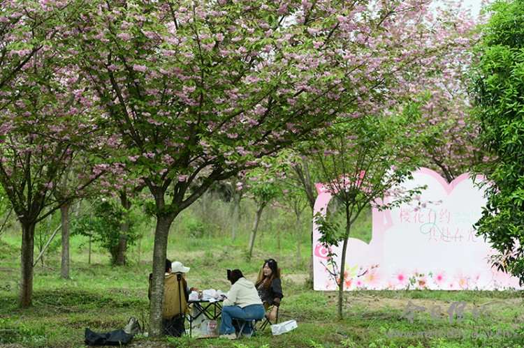 图为4月5日,游客在孝德镇年俗村和剑南街道兴隆村樱花林下休闲游玩的情景。 |