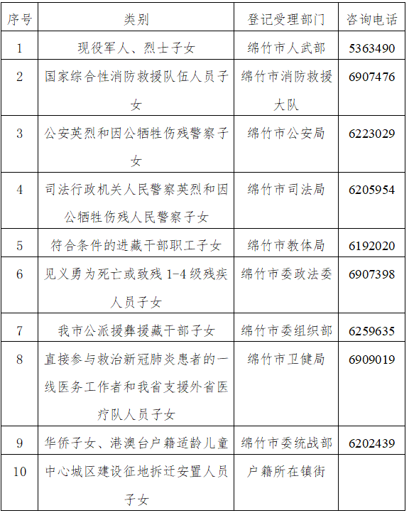 根据《绵竹市政策性适龄儿童入园入学安置办法》(竹教发〔2023〕35号),为切实做好2026年中心城区(二环路内,含学府社区,下同)政策性安置适龄儿童入园入学信息登记工作,现就信息登记工作公告如下。 一、登记对象 (一)学前教育:2026年8月31日(含8月31日)前年满3周岁的适龄儿童。 (二)小学教育:2026年8月31日(含8月31日)前年满6周岁的适龄儿童。 (三)初中教育:2026年的小学毕业生。 二、登记时间 从公告发布之日起到2026年4月24日止。 三、登记受理部门及咨询电话 在办理登记前所需证明材料请咨询登记部门。