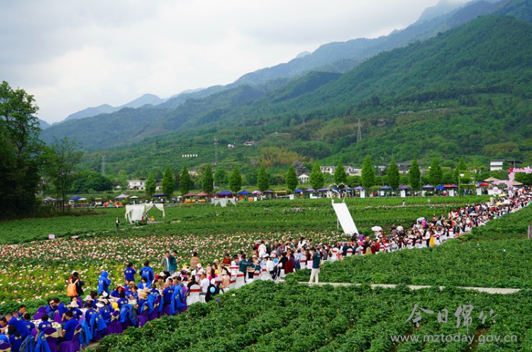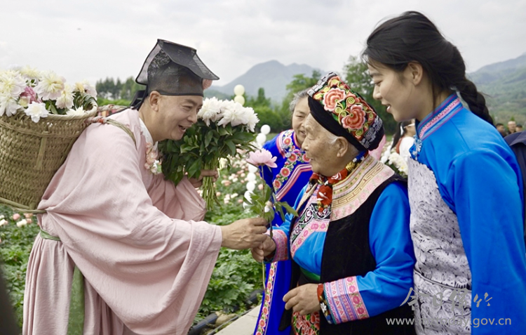 棚花村拥有得天独厚的山水禀赋,为发展“赏花游+乡村游”奠定了坚实基础。前两年,该村瞄准“春景”与“产业”,从成都引来专业种植户,并从山东菏泽引进优质种苗,精心培育出50多个牡丹品种、80多个芍药品种。如今,700余亩花田不仅醉了游人,更延伸出鲜切花生产、药材加工的产业链条。 特色活动聚人气 4月16日,“酒香画境·村游绵竹”九龙分会场——“芍药花仙·千人喜宴”活动正式启幕。活动以花为线,串起赏花、美食、演艺、民俗等多元体验,为游客奉上一场可看、可玩、可品的春日盛宴。 置身花田,仿佛穿越进一幅流动的年画。“骑车仕女”“簪花状元”等传统绵竹年画的经典形象,化作立体装置与互动角色,散落在花径旁、田埂边。游客随时可与这些“年画中的人”合影互动,沉浸式感受传统文化的魅力。更特别的是,还有长者化身“银发花神”,亲手为游客递上一枝枝芍药花,为这场春日之约添了一份温情。