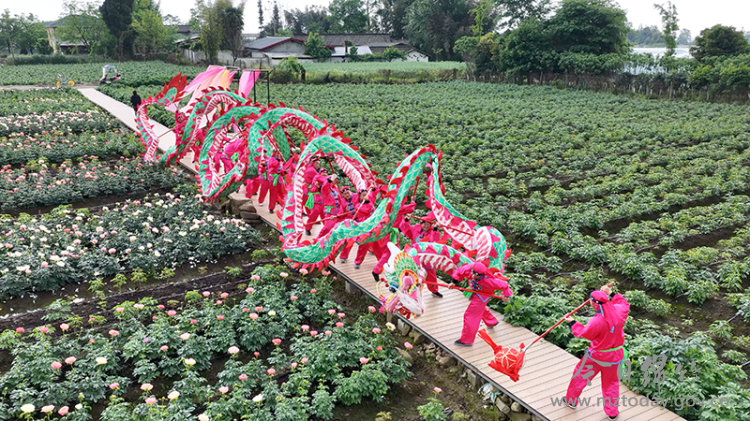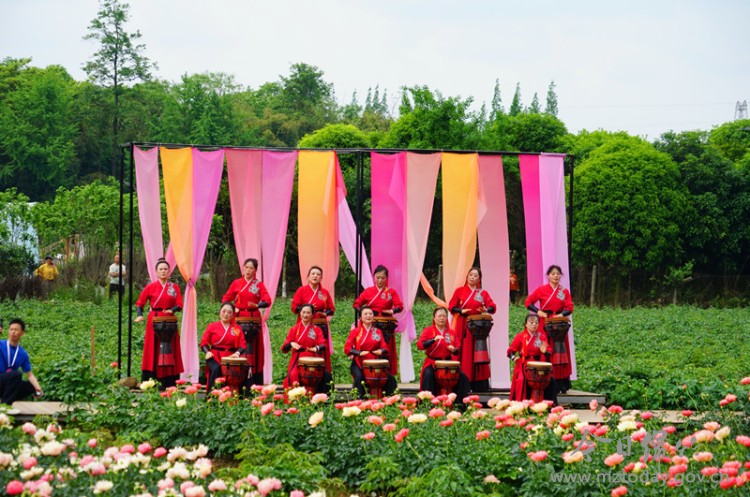 花海千人坝坝宴,是本次活动的“重头戏”。花田步道间,100张圆桌绵延铺开,在缤纷芍药的映衬下蔚为壮观。来自各地的游客围桌而坐,尝地道农家美味、品绵竹醇香佳酿,在缕缕花香与浓浓烟火气的环绕中,解锁田园休闲新玩法。 11点50分,专场文艺演出拉开帷幕。川剧变脸、古典舞蹈、无人机表演等特色节目轮番亮相,引得台下观众连连叫好。“这次活动非常有特色,芍药花争奇斗艳,千人宴场面壮观又热闹,吃得开心,玩得尽兴!” 游客廖述萍说,沉浸式的春日游玩体验,让每位游客都真切感受到了棚花村的淳朴热情与别样魅力。