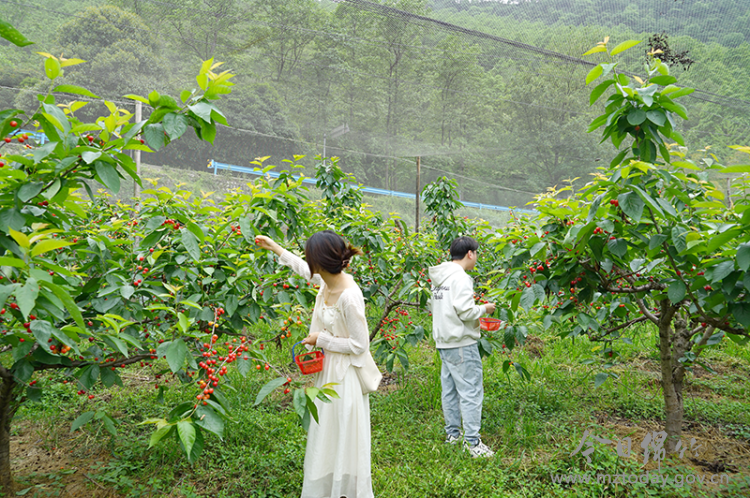 “我们的樱桃从上周末开始采摘,将持续到本月底,目前每斤售价为20元。今年村上还试种了一亩多地的车厘子,研究培育新品种,为抢占市场先机、拓宽增收渠道探路。”据云盖种植专业合作社工作人员付秀蓉介绍,随着乡村旅游不断提质升级,田园采摘游已成为市民和游客周末及节假日休闲出游的新风尚。为此,云盖村因地制宜布局特色林果产业,连片种植樱桃、桑葚、李子、杨梅、柿子等水果100余亩,实现了四季有果可摘、全年景致不断。 “农旅”融合促振兴 水果采摘的火爆,让云盖村的民宿生意“旺上加旺”。