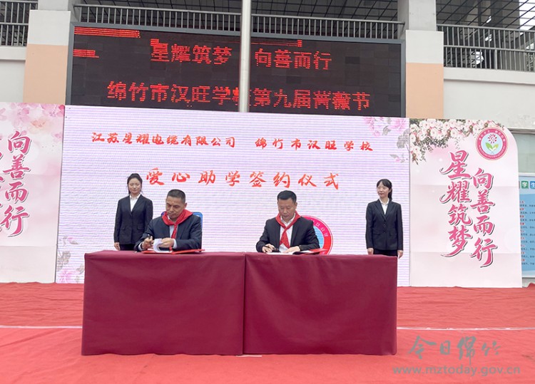 开幕式上,江苏星耀电缆有限公司与汉旺学校举行了爱心助学签约仪式,在今后5年内,该公司每年将向学校捐助10万元助学奖教金,为校园建设、学子成才注入温暖力量。