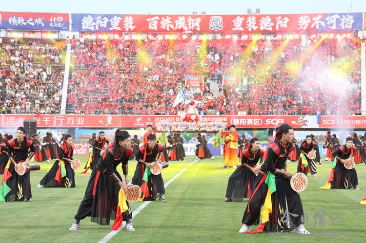 比赛开始前,由罗江区倾力打造的主场文艺展演将罗江非遗底蕴与足球激情深度相融,一场兼具历史厚度与青春活力的文化盛宴激情上演。此次展演紧扣“激情振奋、彰显地方特色”核心,以罗江千年文脉为灵魂,分为暖场与中场两大篇章,古今呼应、亮点纷呈。暖场节目《潺舞》作为罗江专属的非遗民俗歌舞,是整场展演的文化核心。随后,《五丁开山》《诗书雅韵》《荷花龙》《山水同源》等节目轮番上演,让罗江文化在青春表达中焕发新生。