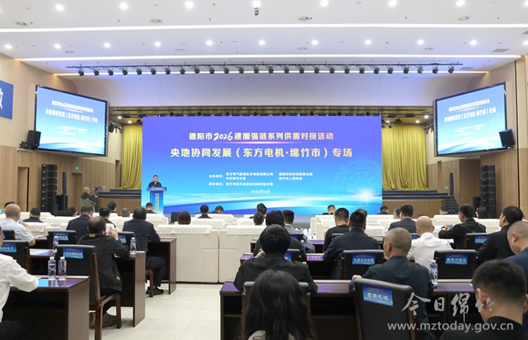 4月27日下午,德阳市2026建圈强链系列供需对接活动央地协同发展(东方电机·绵竹市)专场在绵竹市图书馆举行。德阳市委副书记、市长黄朝阳,东方电气集团东方电机有限公司党委副书记、总经理张天鹏,绵竹市委书记陈阳波出席并致辞。