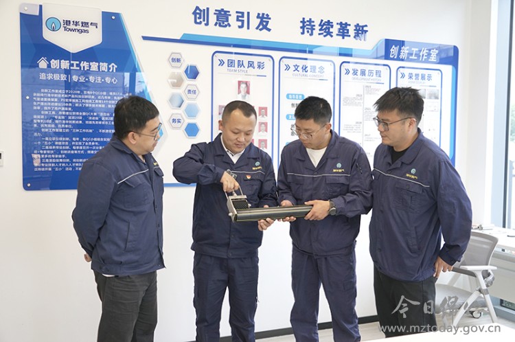 前两年,刘宇又瞄准了燃气置换环节的痛点。管道施工结束后、正式通气前,必须进行燃气置换,传统方式耗时较长,常常影响居民正常用气。他带领团队从花洒分流原理中获得启发,成功研发出新型置换装置,将作业时间缩短20%至30%,大幅提升了置换效率。该项目荣获省总工会优秀“五小”成果奖、全国QC大赛专业级奖项以及国家实用新型专利证书。 从PE管网格线到燃气置换装置,刘宇用一项项落地成果,诠释了“探索者”的执着。他把难题当作创新的起点,将一线视为最好的实验室,在探索燃气技术的道路上留下了一串坚实的脚印。 薪火相传 做团队成长的“摆渡人” 4月27日下午,绵竹港华燃气有限公司创新工作室内,刘宇与团队成员围坐一起,各抒己见、热烈研讨,在思维碰撞中探寻技术突破新方向。桌面上整齐陈列的各类荣誉证书,默默记录着这支团队自2017年以来的成长足迹。